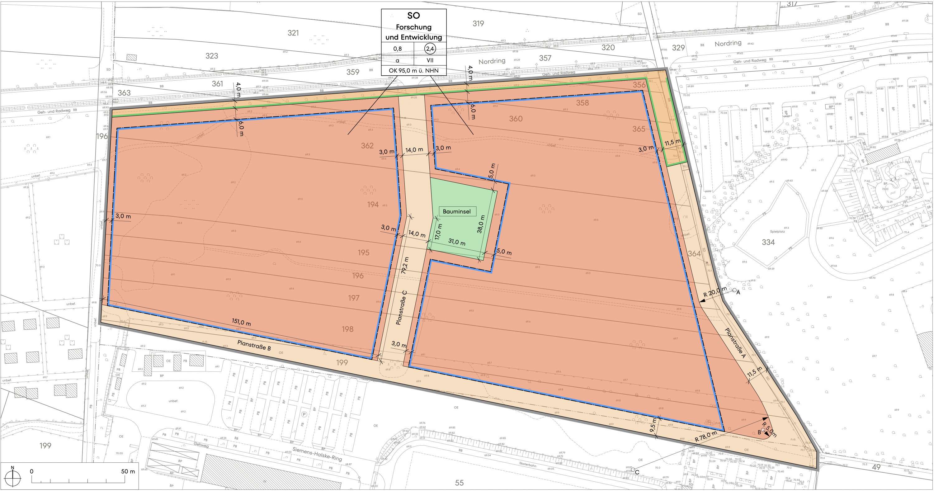 Der Bebauungsplan setzt ein Sonstiges Sondergebiet mit der Zweckbestimmung „Forschung und Entwicklung“ fest und ermöglicht flexible bauliche und funktionale Strukturen, die speziell auf die Anforderungen moderner Forschungsinstitutionen ausgerichtet sind. Damit werden verlässliche Rahmenbedingungen für den Wissens- und Technologietransfer sowie für kooperative Forschungsformate geschaffen.