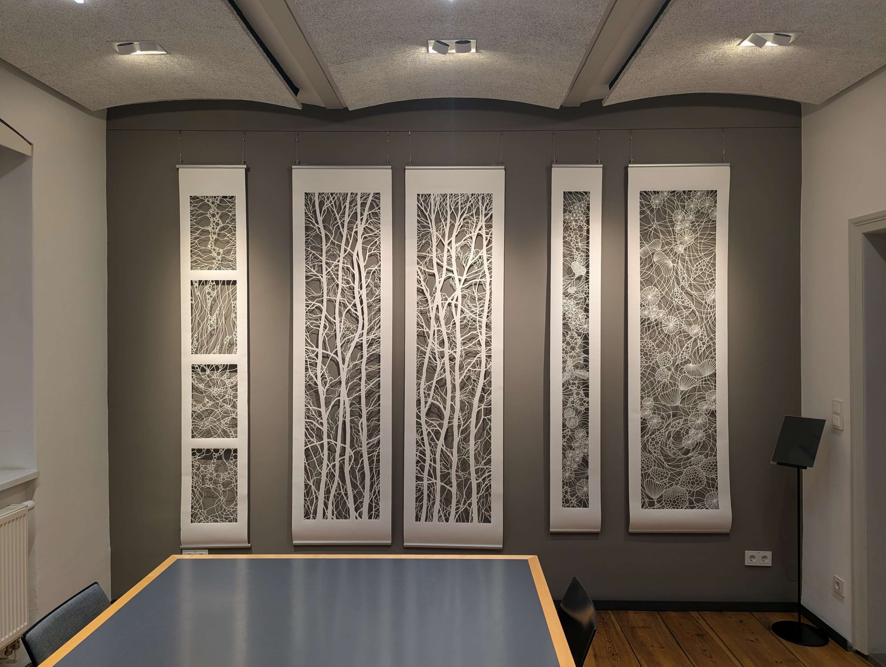 Neu sind ihre großen über zwei Meter langen freihängenden Papierbah- nen,