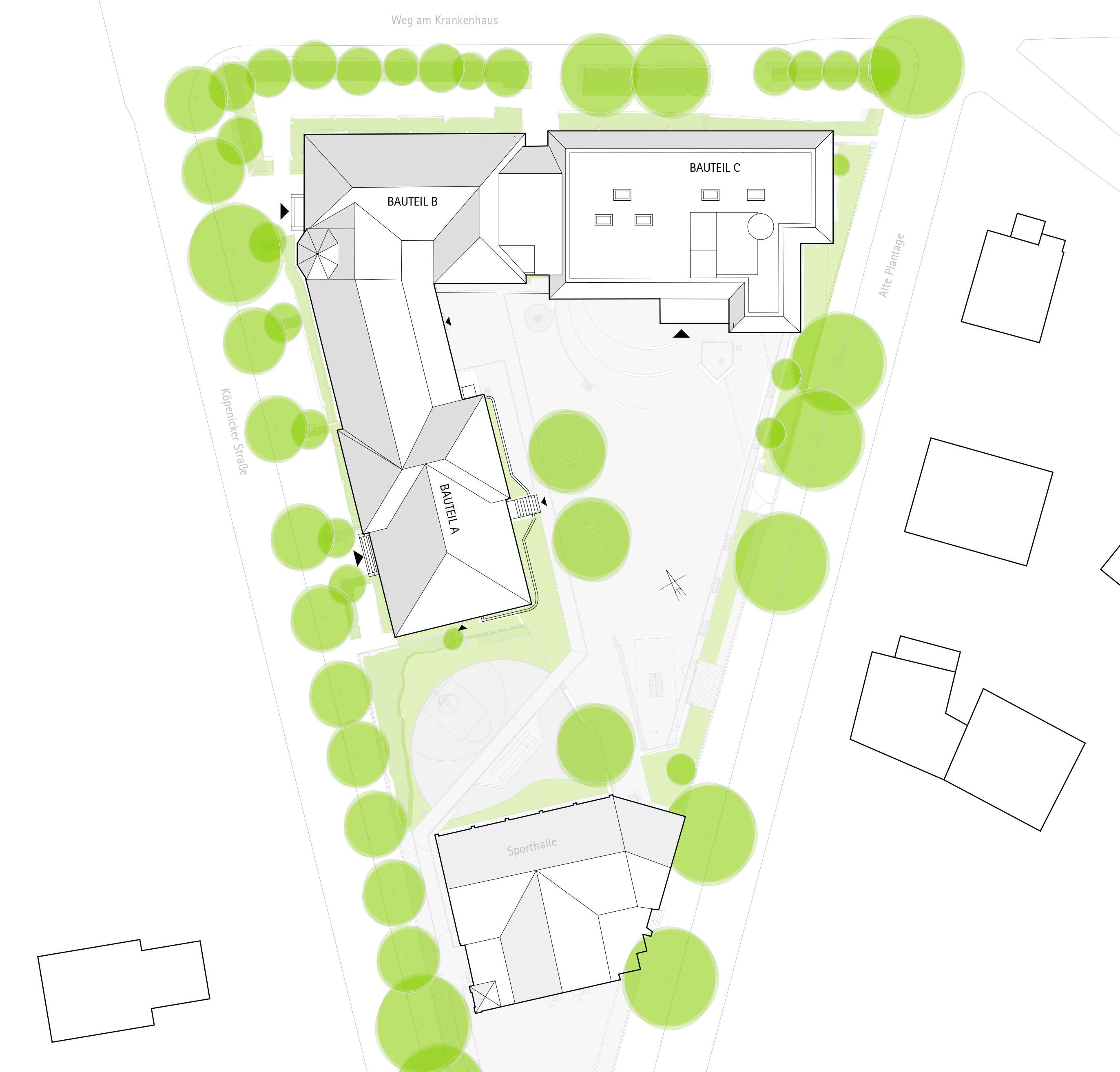 Die Erschließung des Schulgeländes bleibt während der Bauphasen gewährleistet. Interne Wegebeziehungen und Zugänge wurden im Zuge der Umbaumaßnahmen optimiert, sodass ein barrierefreier und sicherer Schulbetrieb möglich war.