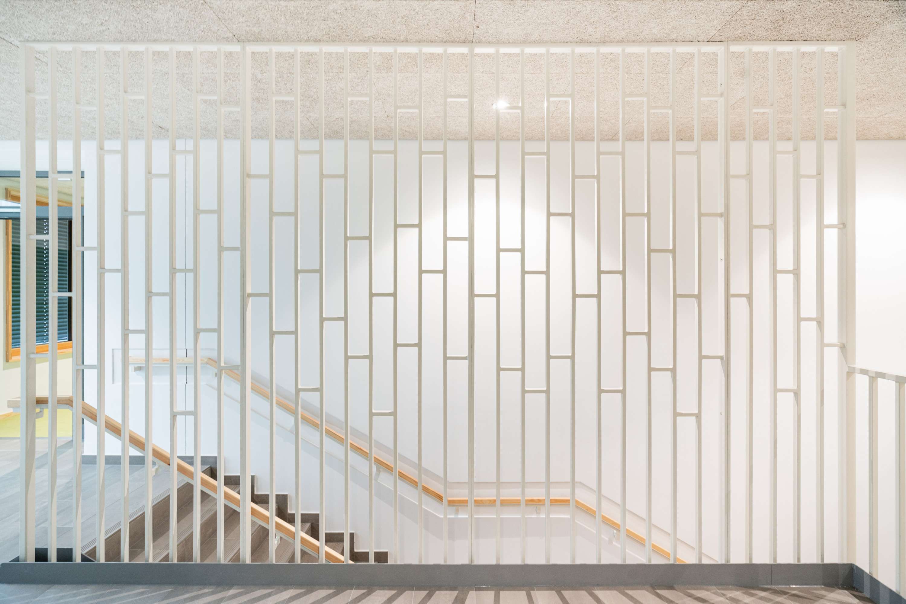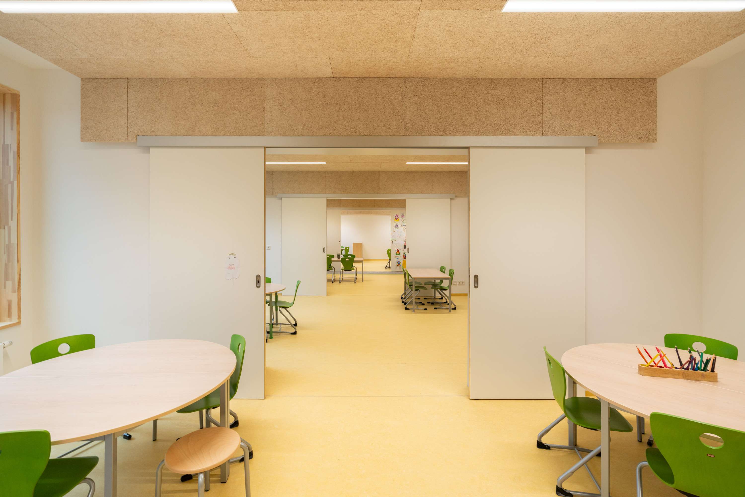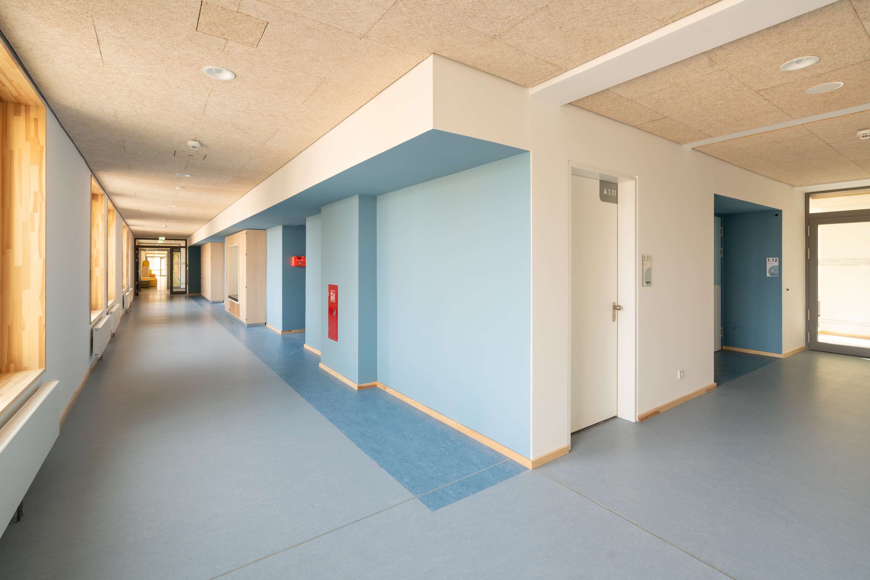 Dabei folgten Entwurf und Setzung dem wichtigen Leitgedanken, an der Gulbener Straße eine neue Adresse für das Schulgrundstück entstehen zu lassen. Der nördliche Anbau an das vorhandene Schulgebäude aus den 70er Jahren erzeugt einerseits die notwendige städtebauliche Präsenz im öffentlichen Raum und schafft gleichzeitig Platz für Schulhof und Sportfreianlagen auf dem Grundstück. Ein weiterer Kniff war notwendig, der Abriss des zweigeschossigen Mittelflügel vom vorhandenen Schulgebäudes. Damit konnte die für den Schulbetrieb notwendige Sporthalle an der südlichen Grundstücksgrenze platziert und klare außenräumliche Verhältnisse auf dem Grundstück geschaffen werden. Die Außenraumgestaltung unseres Planungspartners hutterreimann landschaftsarchitektur betont die Zugänglichkeit des Schulgeländes von Süden und Norden und platziert die für den Pausen- und Hortbetrieb doppelt genutzte Sportflächen im Norden. Im kleineren Westhof sind Flächen für die Hortnutzung und Schülerspeisung vorhanden.