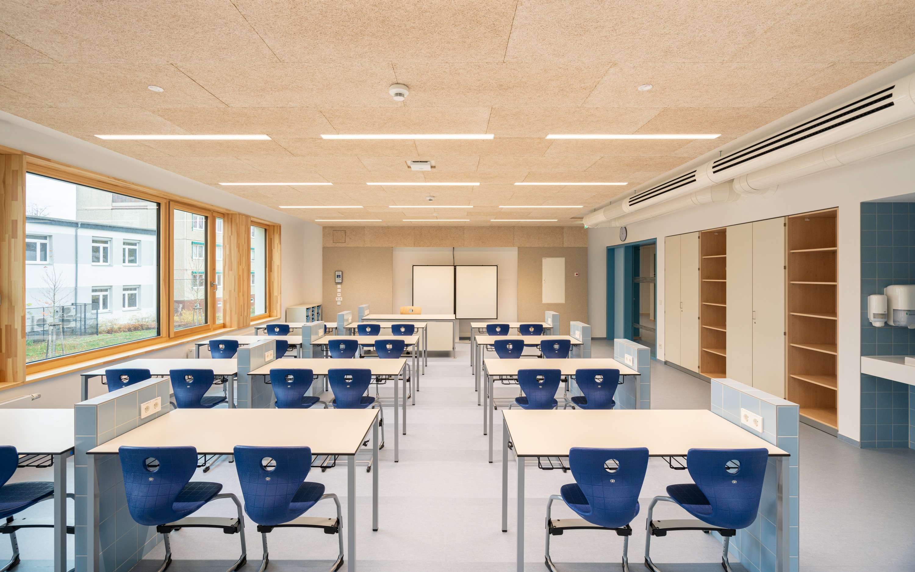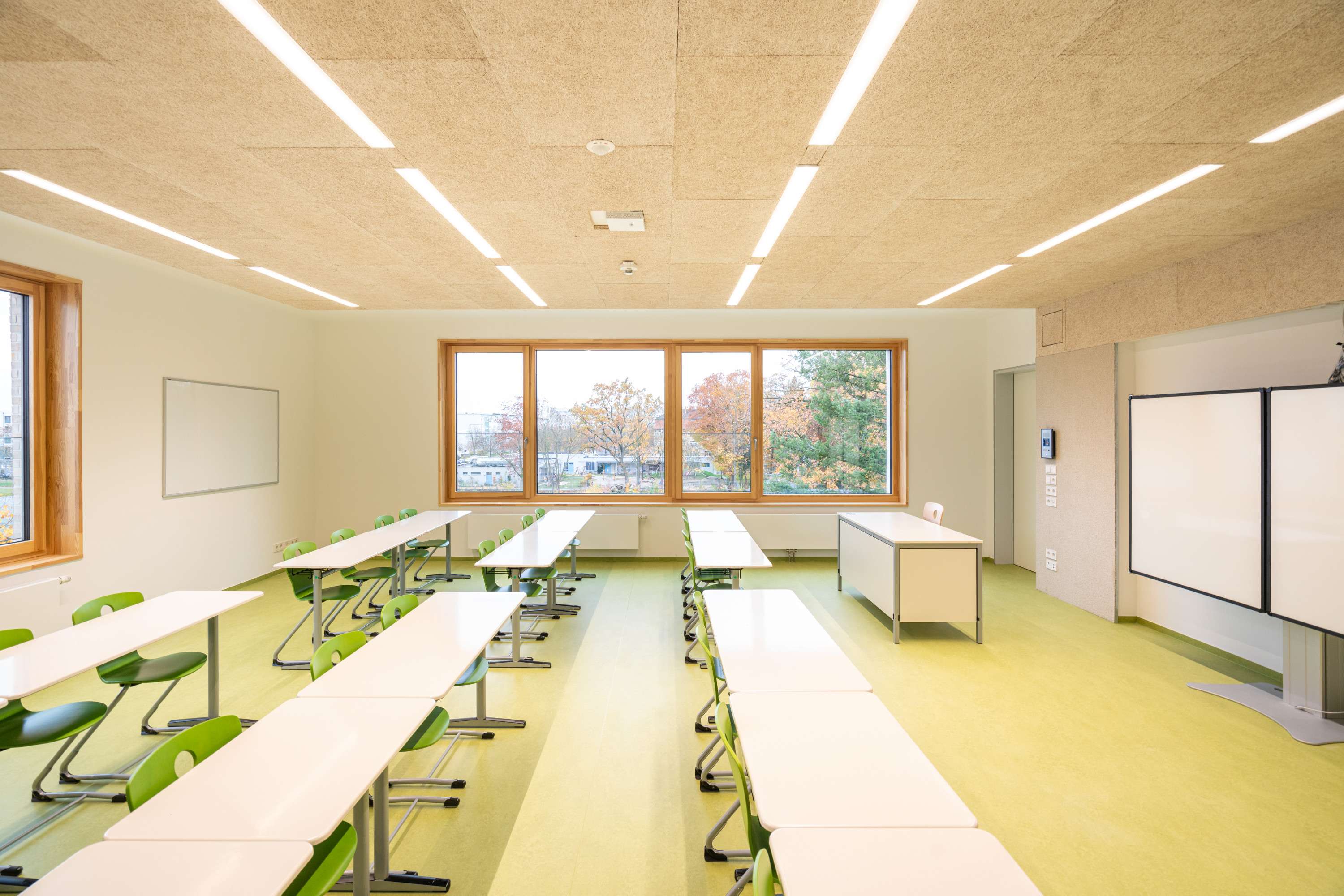 Die Haustechnikkonzepte folgen den aktuell üblichen Standards, dezentrale Warmwasserversorgung, teildezentralisierte Lüftungsanlagen oder tageslichtabhängige Kunstlichtversorgung der Klassenräume. Die Schule ist raumakustisch vollausgestattet, in Fluren, Unterrichts- und Funktionsräumen sind an horizontalen Decken- und vertikalen Wandflächen passive Absorber der Klassen A und B eingesetzt.